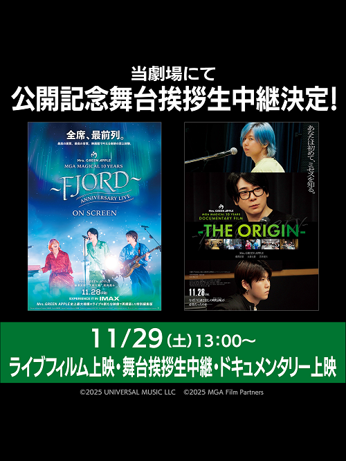 ※『MGA MAGICAL 10 YEARS ANNIVERSARY LIVE ~FJORD~ ON SCREEN』の上映後に舞台挨拶生中継を実施し、生中継後に『MGA MAGICAL 10 YEARS DOCUMENTARY FILM 〜THE ORIGIN〜』の上映がございます。