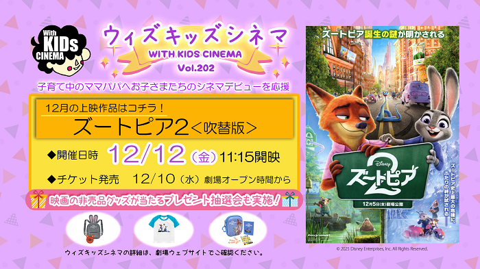 12/12(金)には、未就学のお子さま連れのお客さま限定の親子鑑賞会「ウィズキッズシネマ」もプレゼント抽選会付きで開催します。今月だけはイベント名を「ウィZOOキッZOOシネマ」に変えたい気分です。笑