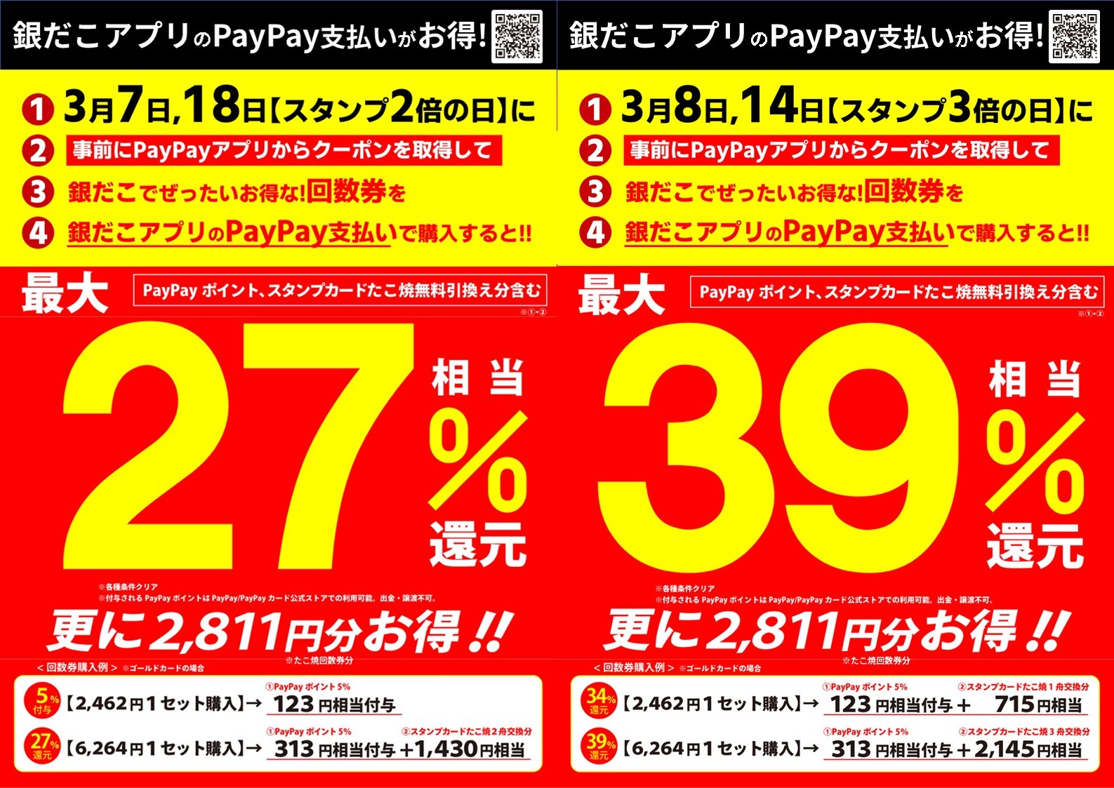 今回の 『ぜったいお得な!回数券』 を、“最もお得” にご購入いただく方法は、①スタンプが “3倍” となる3月8日(日)と14日(土)に、②PayPayクーポンを事前に獲得 し、③対象店舗にて、 PayPay にて決済・ご購入 いただくと、決済額の最大5%相当の PayPay ポイント付与に加え、銀だこスタンプカードのスタンプも3倍獲得ができ、一気にランクアップやたこ焼が無料でもらえる “ビッグチャンス” です!!
