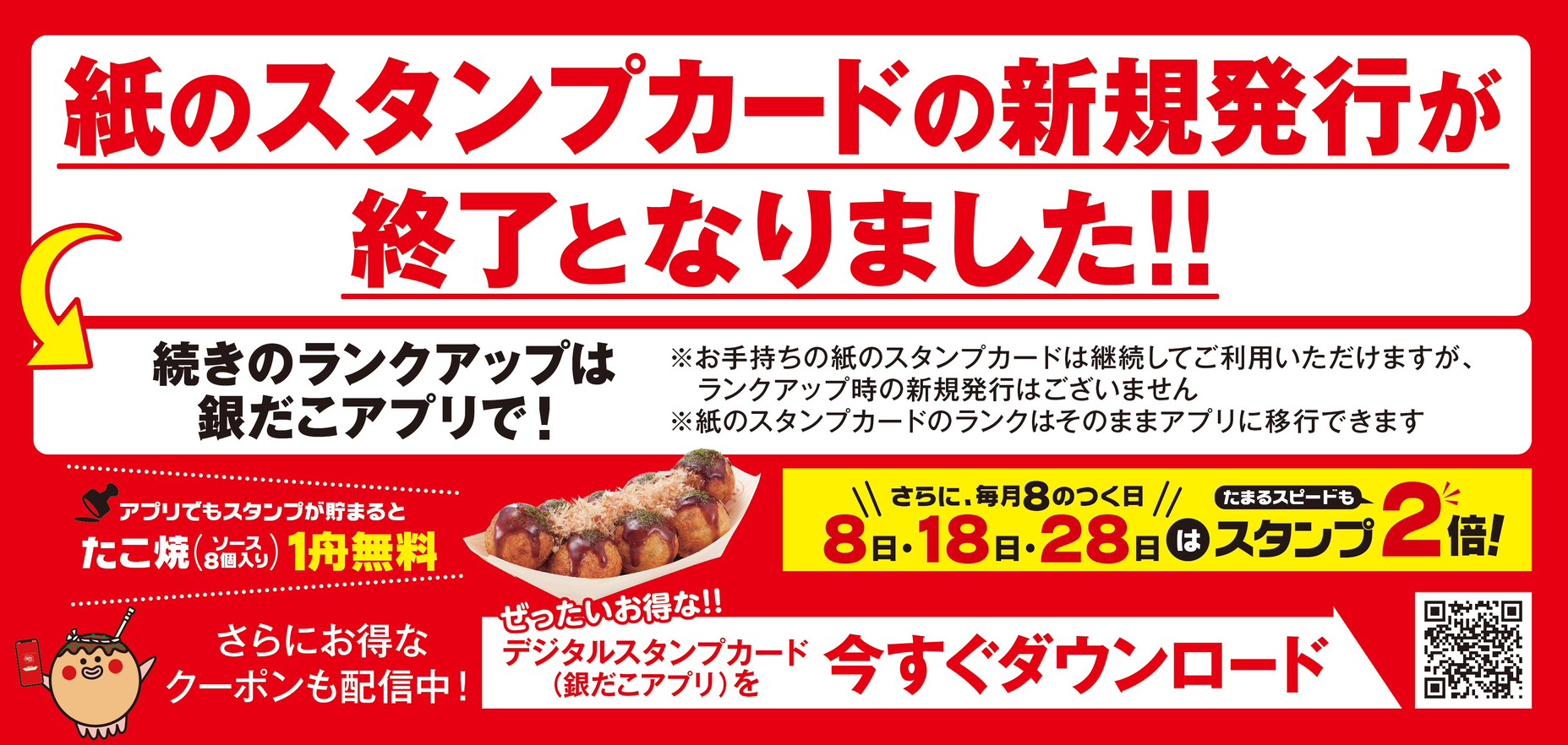 「紙の銀だこスタンプカード」 の新規発行(銀・ゴールドへの更新を含む)は、2026年2月18日(水)をもって終了しました。