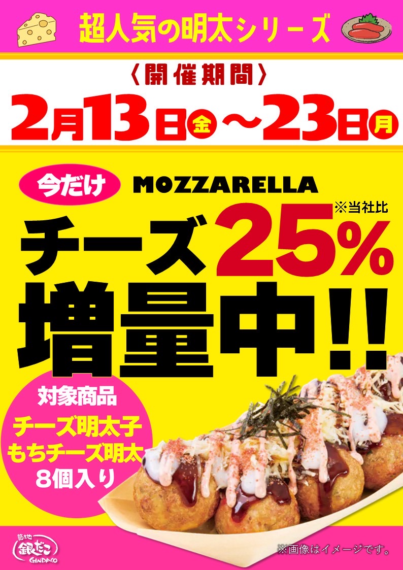 2/13(金)から2/23(月)の期間限定でたっぷりチーズのチーズ明太子、焦がし醤油もちチーズ明太のチーズを25%増量中です。ぜひこの機会にご利用お待ちしております。