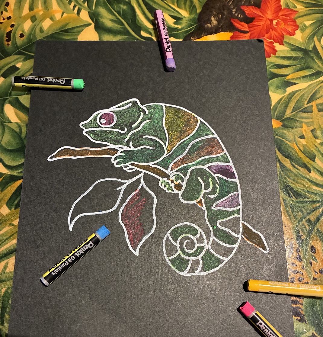 黒いボードに、カラフルなオイルクレパスで動物の絵を描いてみませんか?