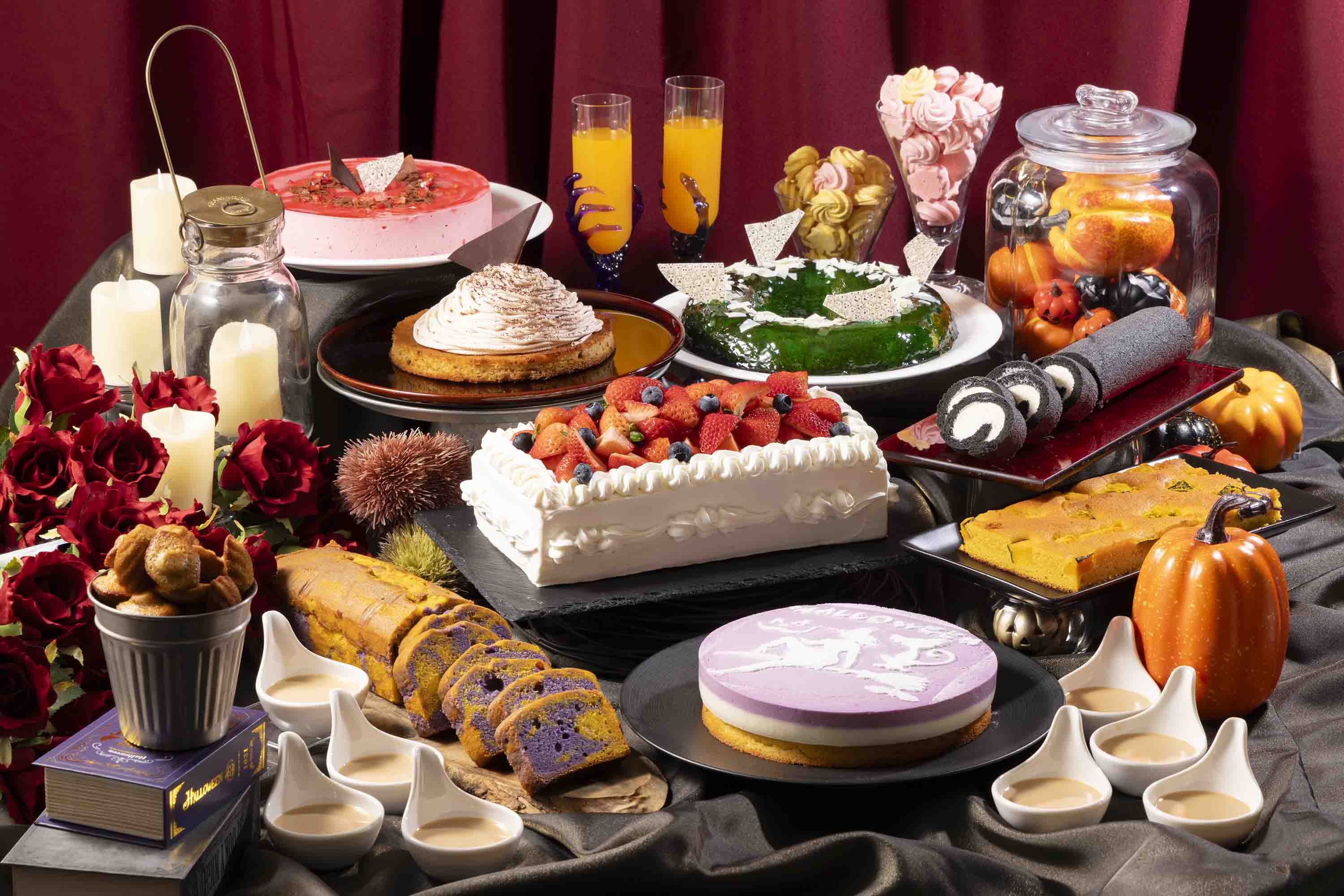 黒のヴェールに包まれた、ミイラ男の隠された甘美な誘惑を表現した“ミイラ男が本気で巻いた竹炭ボーンロール”をはじめ、肉好きな狼男も思わず喉を鳴らして微笑む“狼男も唸るキャラメルプリン”、ハロウィンの夜に現れるおばけが甘い夢へと誘う、紫芋とかぼちゃでマーブル模様に仕上げた“おばけのまどろみパウンドケーキ”など、秋の味覚をふんだんに使用したスウィーツに酔いしれる、甘美なひと時をビュッフェスタイルでお楽しみいただけます。