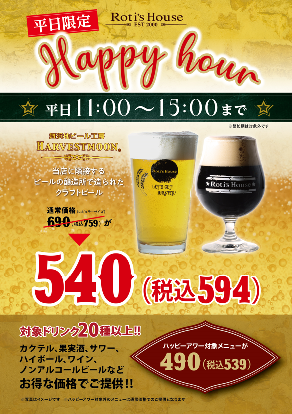 \ ロティズ・ハウスでは、平日限定ランチタイムにハッピーアワーを開催しております /