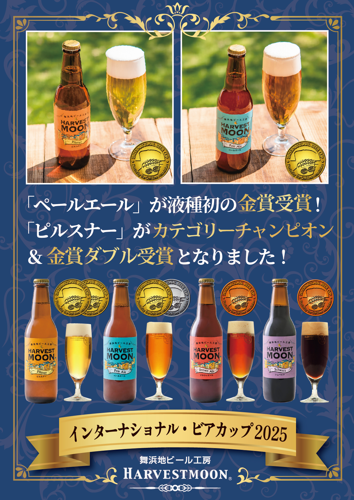世界五大ビール審査会の一つであるビール審査会「インターナショナル・ビアカップ2025」(クラフトビア・アソシエーション(日本地ビール協会)主催)において、舞浜地ビール工房「ハーヴェスト・ムーン」の醸造するビールが6つのメダルを受賞しました。