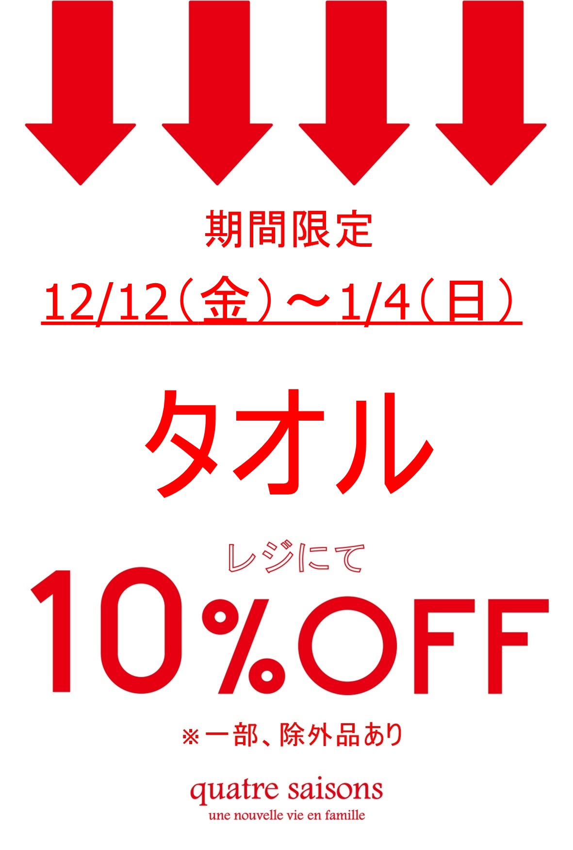 タオルをお買い上げで、レジにて10%OFFいたします。