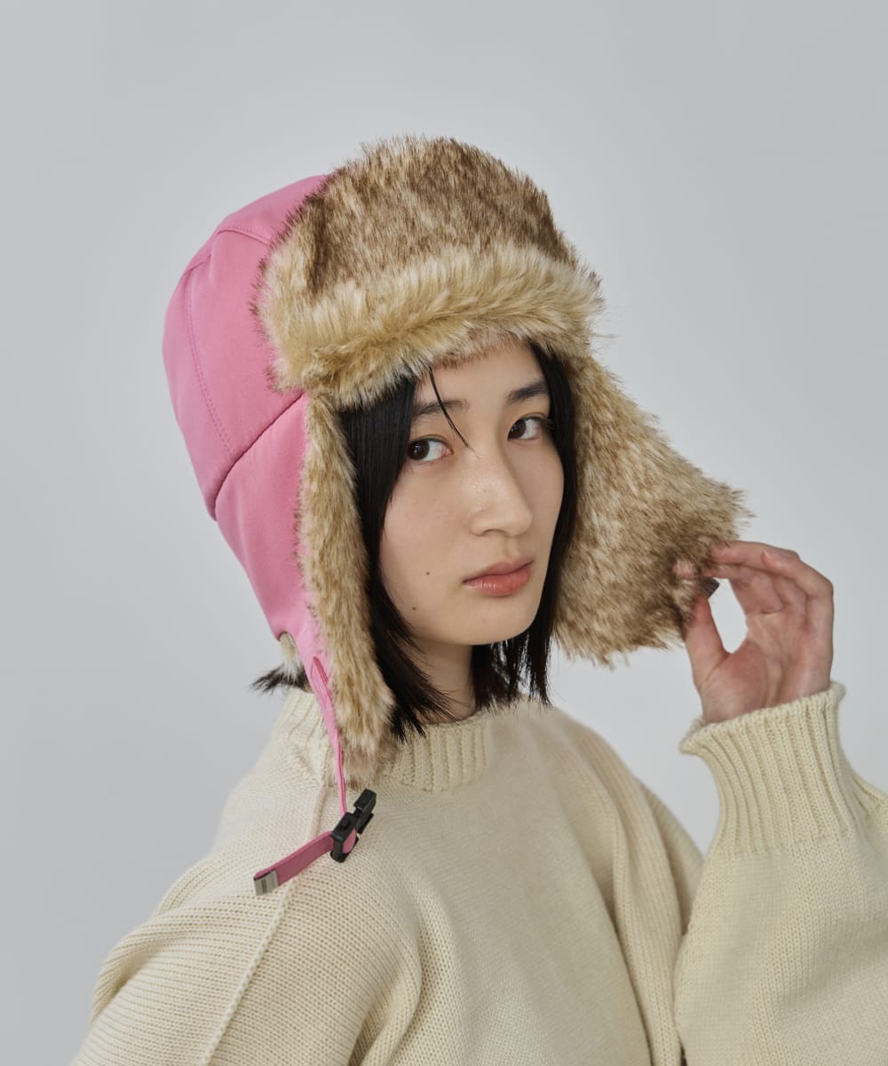 フェイクファー素材を全面に使用したトラッパーキャップ。毛先に動きを持たせたミニファー素材がボリューム感を演出し、カジュアルさとかわいさのバランスが程よい使いやすいデザイン。あご紐はスエードベルトとメタルスナップ仕様でハードな印象をプラスし、甘辛ミックスの仕上がりに。バックサイドにはトリミングも兼ねたスエードベルトアジャスターを配し、サイズ調整が可能です。ご家庭の洗濯機で洗えるのも嬉しいポイントです。