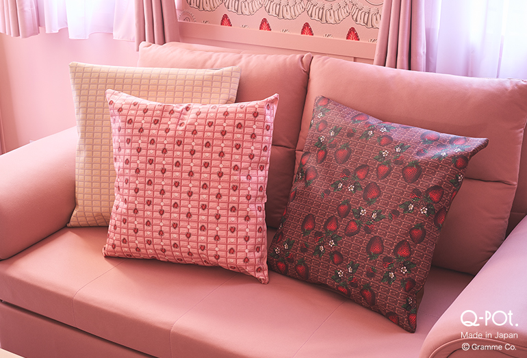 オリジナルデザインの“クッションカバー”はビター(ブラウン)、ストロベリー(ピンク)、ミント、ブラック、ホワイトチョコレートと