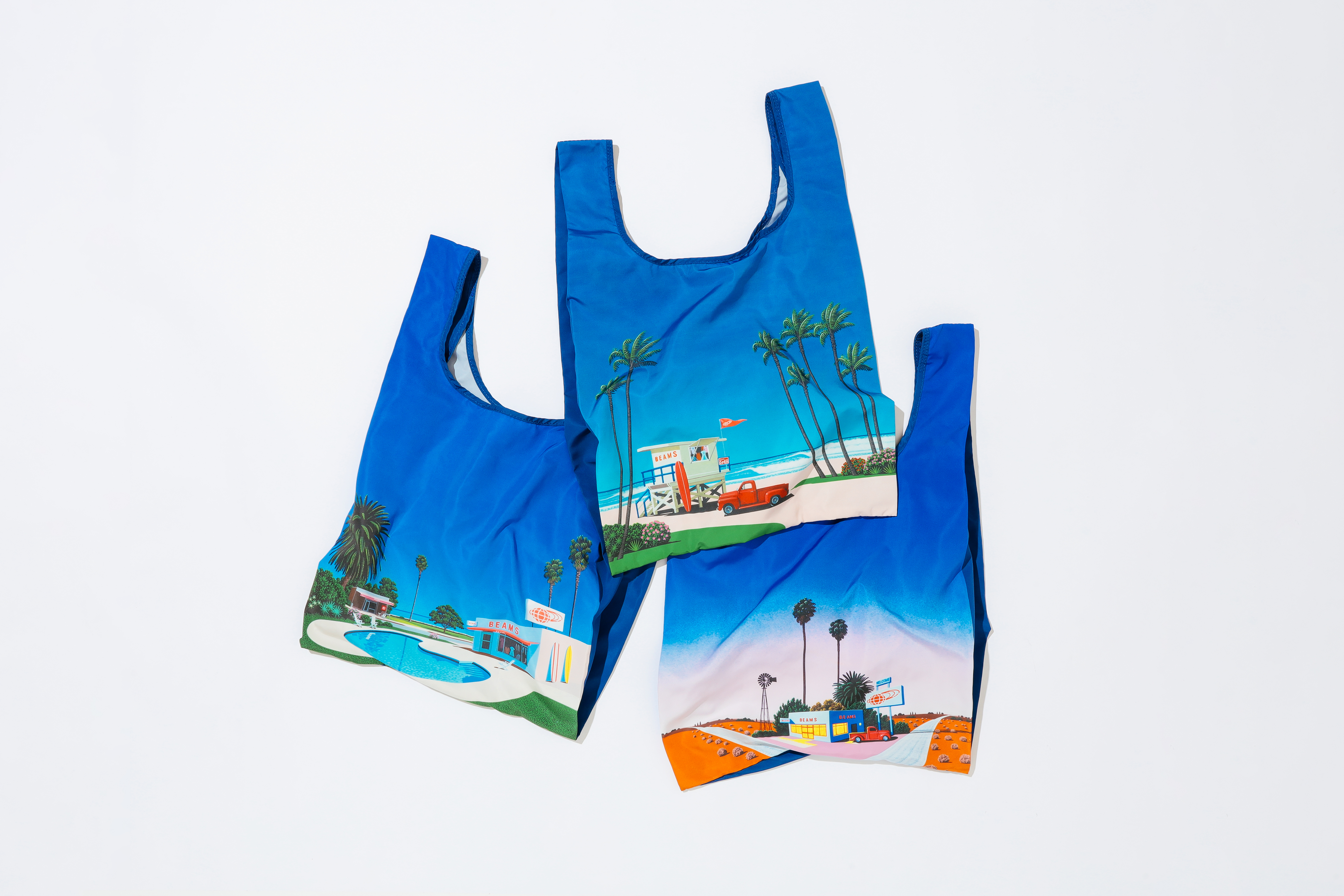1976年の創業から、おかげさまでBEAMSは50周年を迎えます。感謝の気持ちを込めて、今回はイラストレーター永井博氏が長年にわたりBEAMSのために描き下ろしてきたアートワークを施したポータブルトートバッグをご用意。