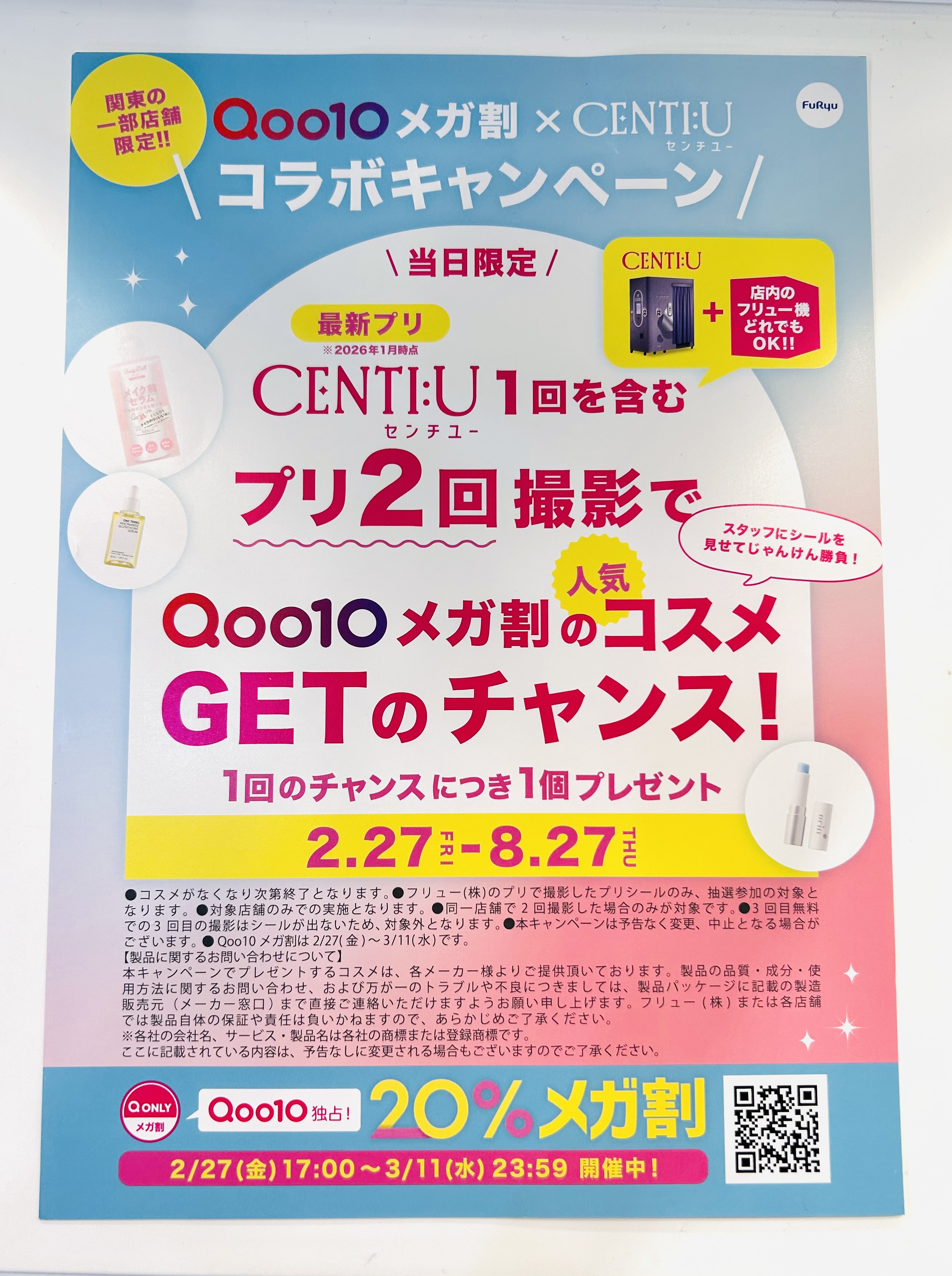 最新プリ機【CENTI:U】1回を含め、プリを2回撮影してスタッフとのじゃんけんに勝つと、Qoo10人気コスメをGETできるキャンペーンとなっております⭐️