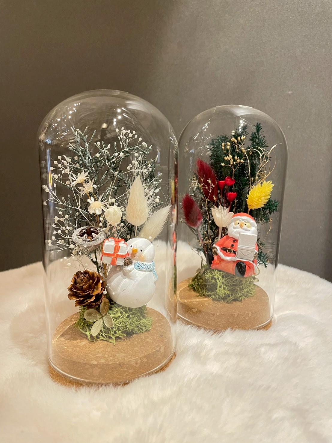 かわいらしいサンタさんや雪だるまのオブジェを入れた箱庭風アレンジ。