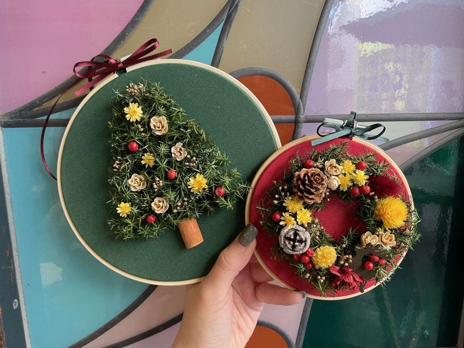 刺しゅう枠に布地を挟み込み、そこにお花を1つ1つ接着してクリスマスツリーを表現しています。壁掛けはもちろん、市販のミニイーゼルを使って飾るのもとってもおすすめです♪