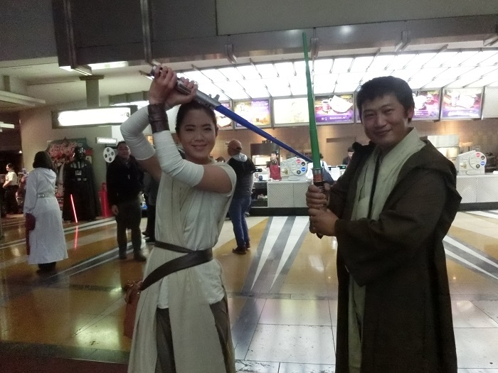 皆さんの内なるフォースを解放して思いっきりお楽しみいただけるように上映中、C3POみたいにおしゃべりしたり、お気に入りのキャラが出てきたら名前を呼んだり拍手したりと普段出来ないことを思いっきりやっちゃってOK、そんな主旨の元、お集まりいただきました。加えて、自慢のライトセーバーを持ち込んでの鑑賞OK、お気に入りのキャラクターのコスプレも可、ということでシネマイクスピアリはいつにない賑わいをみせました!