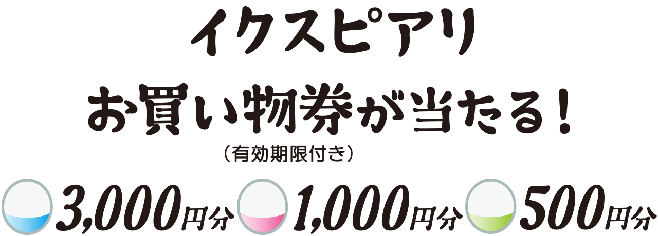 当日、イクスピアリ内でご利用のレシート3,000円(税込・合算可)以上のご提示で、「買って回そう!ビッグリ!ピアリガチャ」に1回ご参加いただけます。※3,000円未満のレシートのみ合算可。