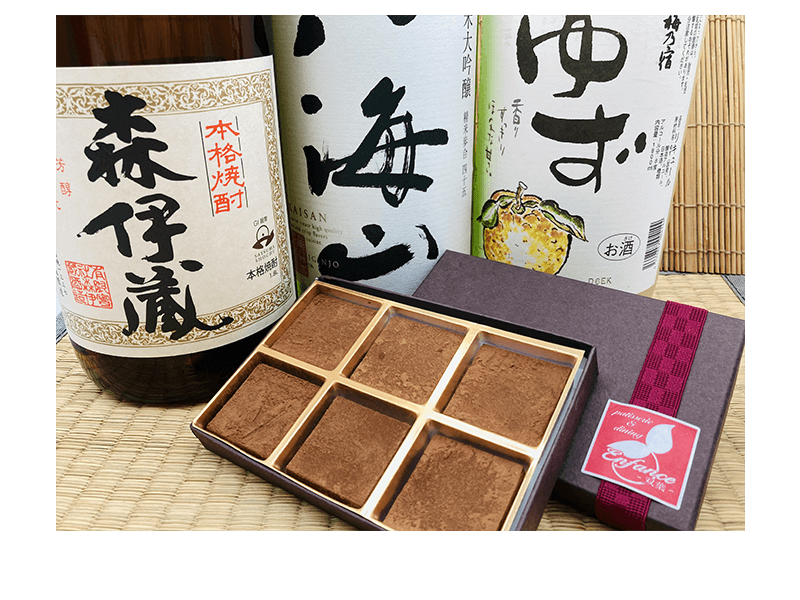 芋焼酎『森伊蔵』、日本酒『八海山』、果実酒『ゆず酒』の3種を使用したお得なアソートセットの生チョコレートです。