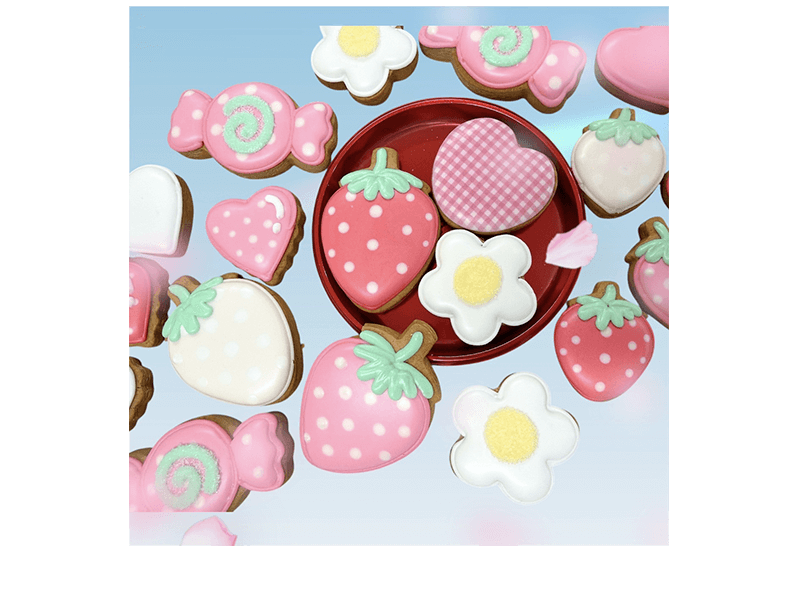 甘酸っぱいいちごをイメージしたやさしい色合いと、春のときめきを、甘く可愛いクッキーでお楽しみください。