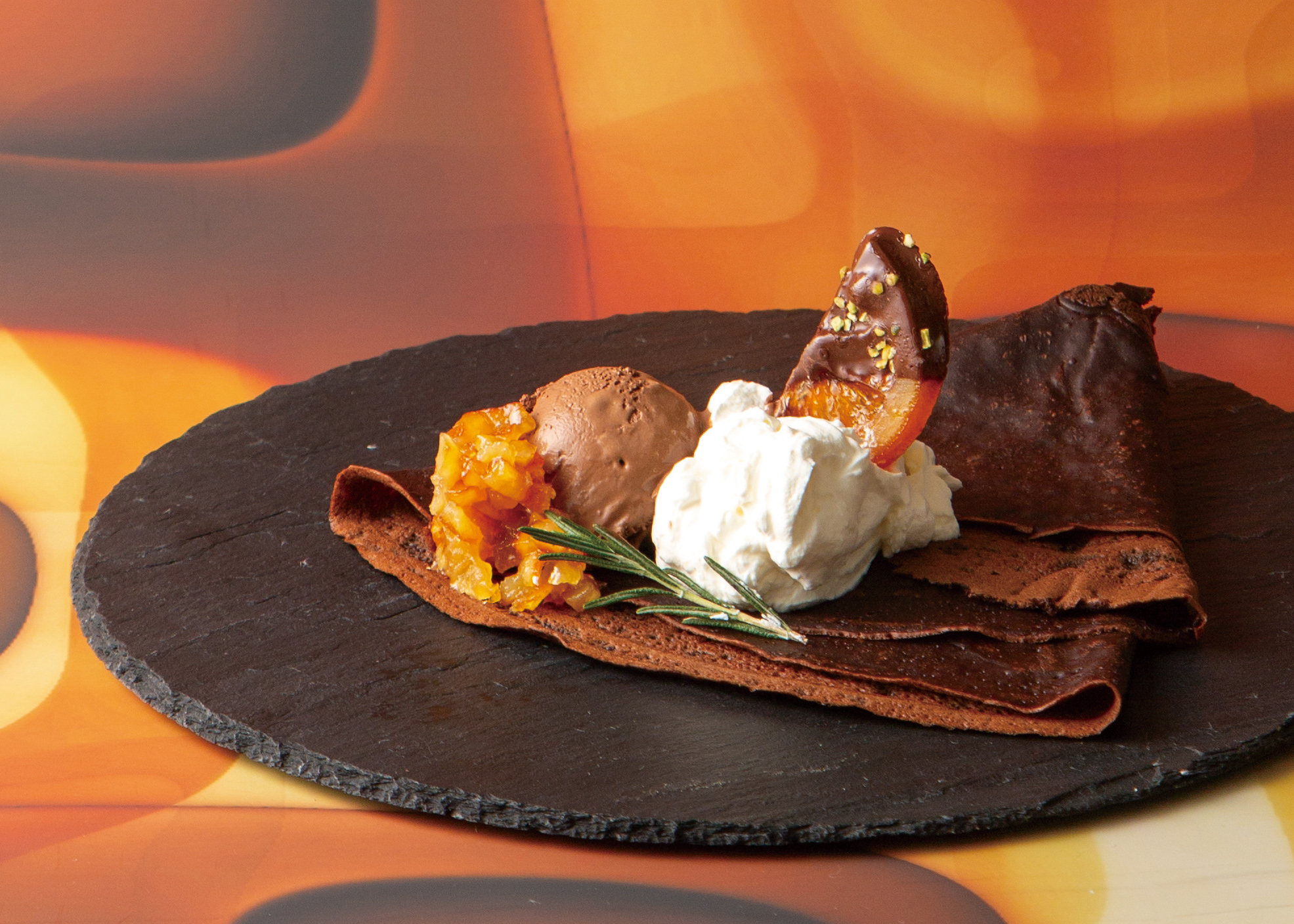 トンカ豆をココア生地に練り込んだ自家製クレープ生地に