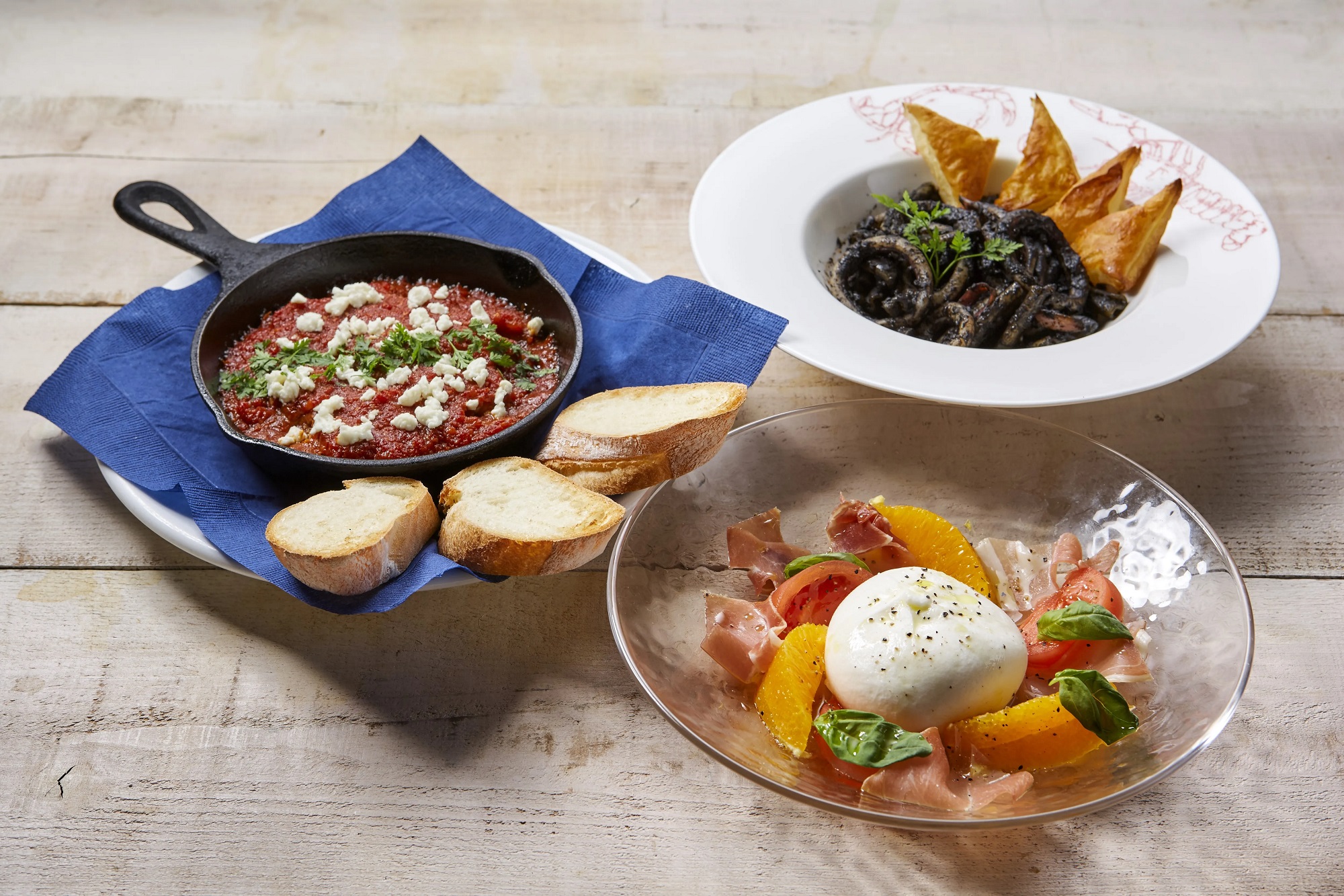 ギリシャで長く愛され続ける伝統的なメニュー。プリプリの海老をにんにくが効いたトマトソースで焼き上げました。羊やヤギのフレッシュミルクから作られるフェタチーズとご一緒にどうぞ。