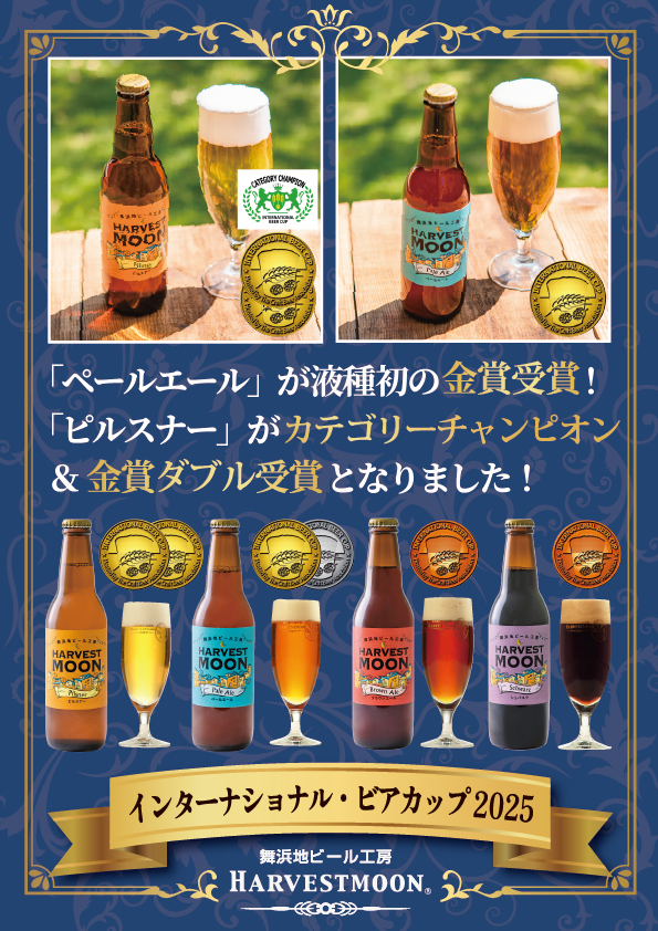 世界五大ビール審査会の一つであるビール審査会「インターナショナル・ビアカップ2025」(クラフトビア・アソシエーション(日本地ビール協会)主催)において、舞浜地ビール工房「ハーヴェスト・ムーン」の醸造するビールが6つのメダルを受賞しました。