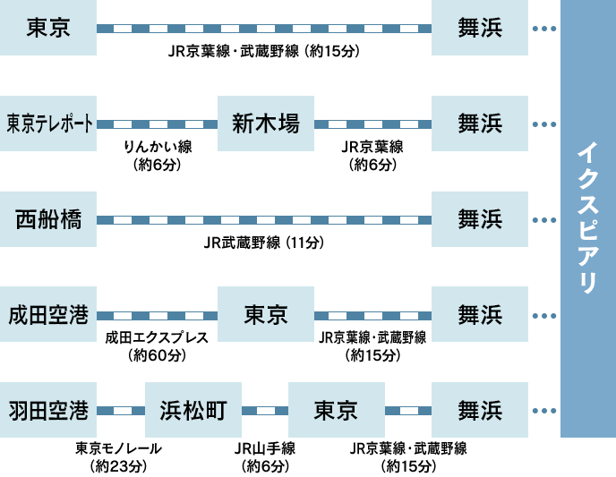 東京駅よりJR京葉線・武蔵野線をご利用で約15分 舞浜駅(南口)下車すぐ