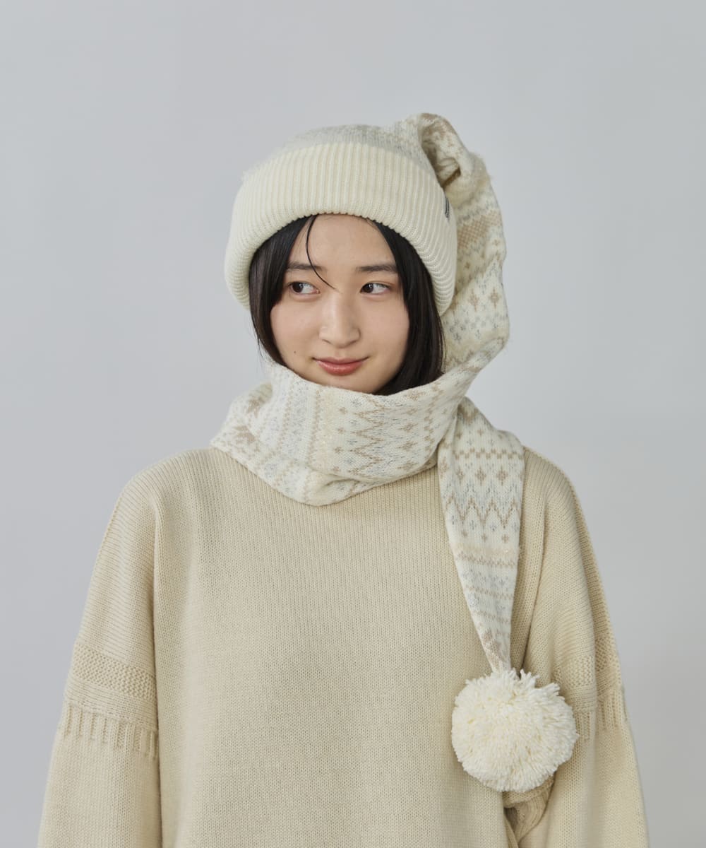 今までにはない長さが魅力の特別なニット帽子。そのまま垂らして被れば、コーディネートの主役になること間違いなしの存在感たっぷりなデザイン。首元にぐるりと巻いてマフラー風にしたり、結んでアレンジしたりと、気分に合わせて自由なスタイリングを楽しめます。オリジナルのノルディック柄には、ラメ糸やファーヤーンを織り交ぜ、冬らしいきらめきとふんわり感をプラスしました。他にはない今シーズン限定の柄で、特別感あふれる仕上がりに。防寒性とファッション性を兼ね備えた、OVERRIDEならではの遊び心あふれるアイテムです!