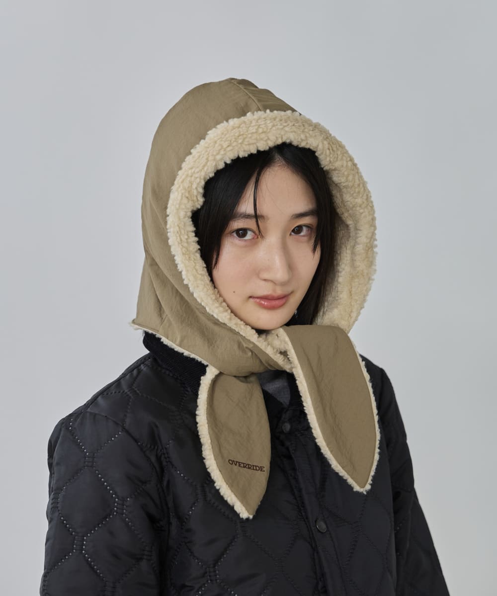ヴィンテージライクなボアと撥水加工を施したナイロン生地の2つの表情が楽しめるリバーシブル仕様のフード。ボア側を内側にしてスカーフのように「真知子巻き」スタイルで着用すると、耳から首元までしっかり防寒できます。トレンド感のあるアイテムながら、フード部分を被らずに着用したり、天候やスタイリングに応じて使い分けが可能で、機能性に優れた秋冬の新定番として汎用性の高いヘッドウェアです。