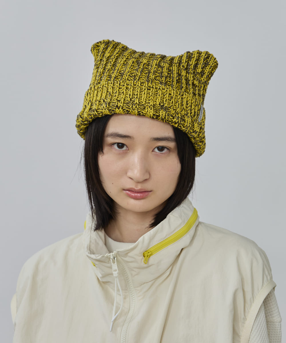 かわいい猫耳になるニット帽。ビーニーとして被るときはゆったりとみみを後ろに寝かせて被ったり、カフを折り上げてワッチにすればみみがピンッと立ち上がります。ざっくりとした太めの糸とスラブ調のファンシー糸をミックスさせました。コットン混のさらっとした素材感なので年間通して被っていただけます。SNSでもトレンドに上がってきているアイテムなので、イベントやお友達との双子コーデにも◎