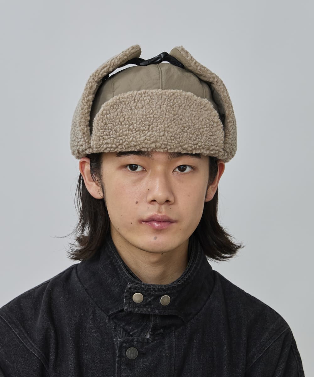 撥水加工を施したナイロンタフタとコンパクトなボア素材を組み合わせたトラッパーハット。左右にはICカードや使い捨てカイロが入るポケットを備え、実用性に優れて外出時の利便性を高めます。表側のナイロン生地はコットンライクでナチュラルなシワ感があり、内側はボリュームを抑えたコンパクトなボアを使用しているため悪目立ちせず、タウンユースにも取り入れやすい仕上がりです。マシンウォッシャブル対応で、使用後のケアも簡単です。