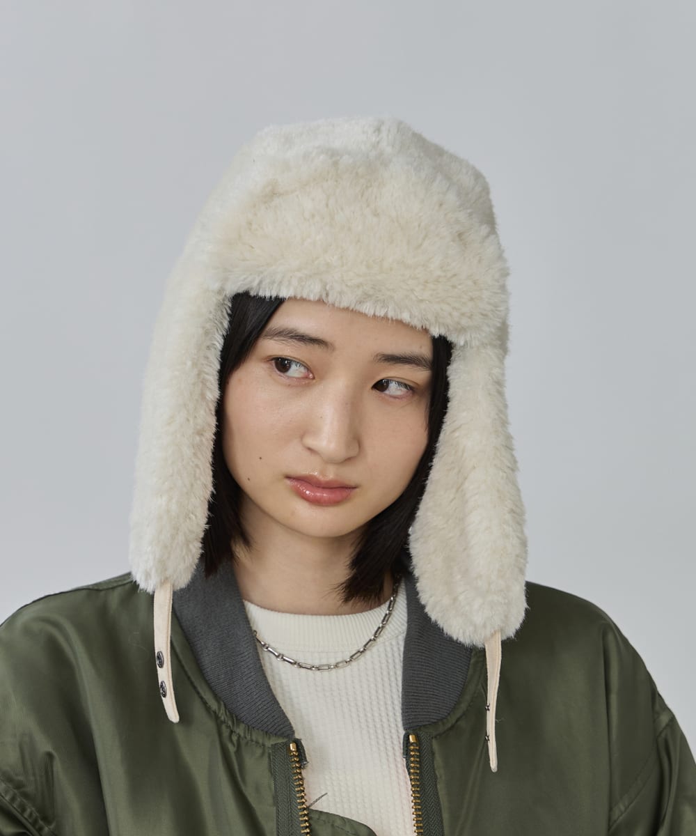 フェイクファー素材を全面に使用したトラッパーキャップ。毛先に動きを持たせたミニファー素材がボリューム感を演出し、カジュアルさとかわいさのバランスが程よい使いやすいデザイン。あご紐はスエードベルトとメタルスナップ仕様でハードな印象をプラスし、甘辛ミックスの仕上がりに。バックサイドにはトリミングも兼ねたスエードベルトアジャスターを配し、サイズ調整が可能です。ご家庭の洗濯機で洗えるのも嬉しいポイントです。
