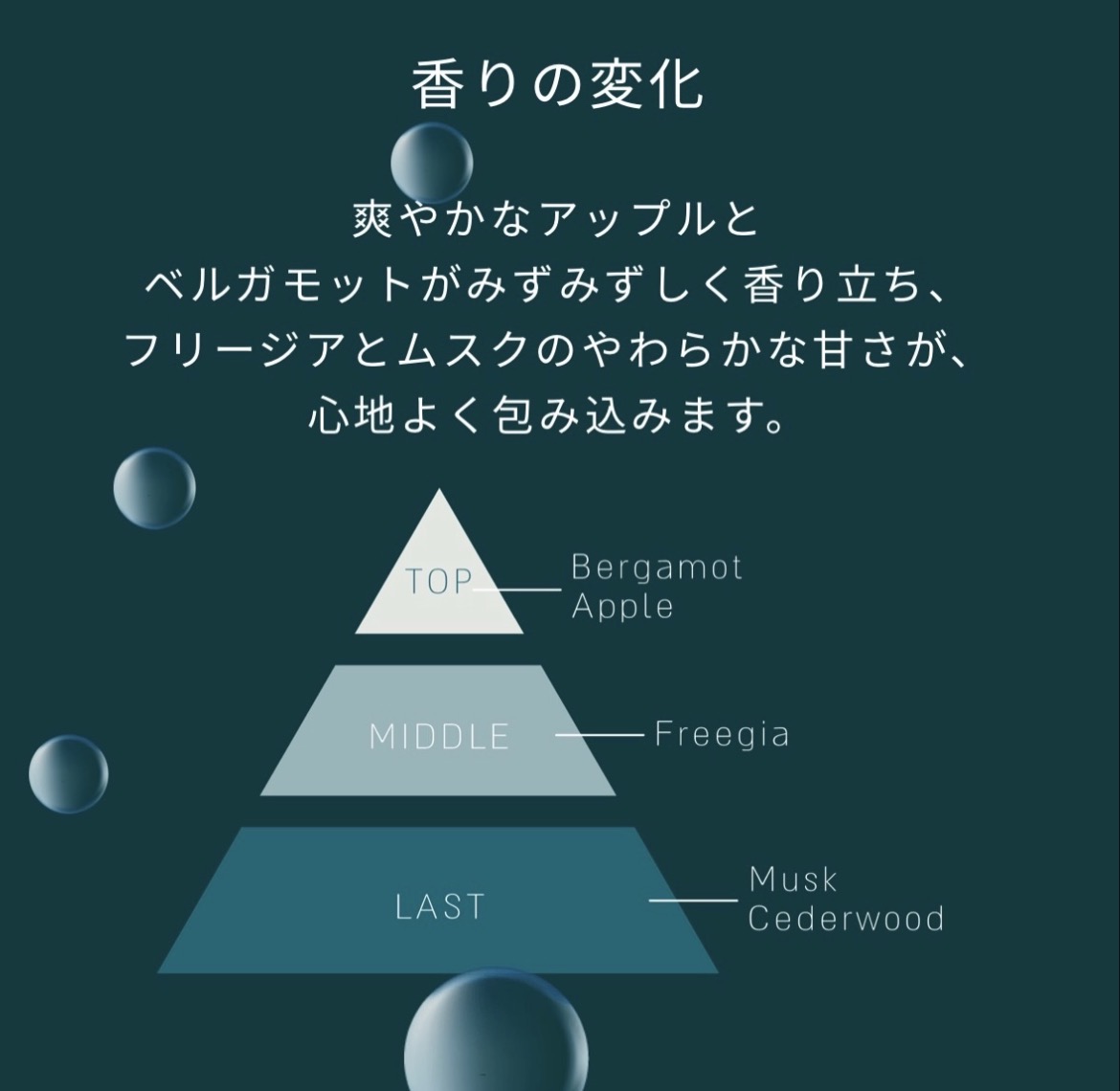ミネラル : 爽やかなアップルとベルガモットがみずみずしく香り立ち、フリージアとムスクのやわらかな甘さが、心地よく包み込みます。