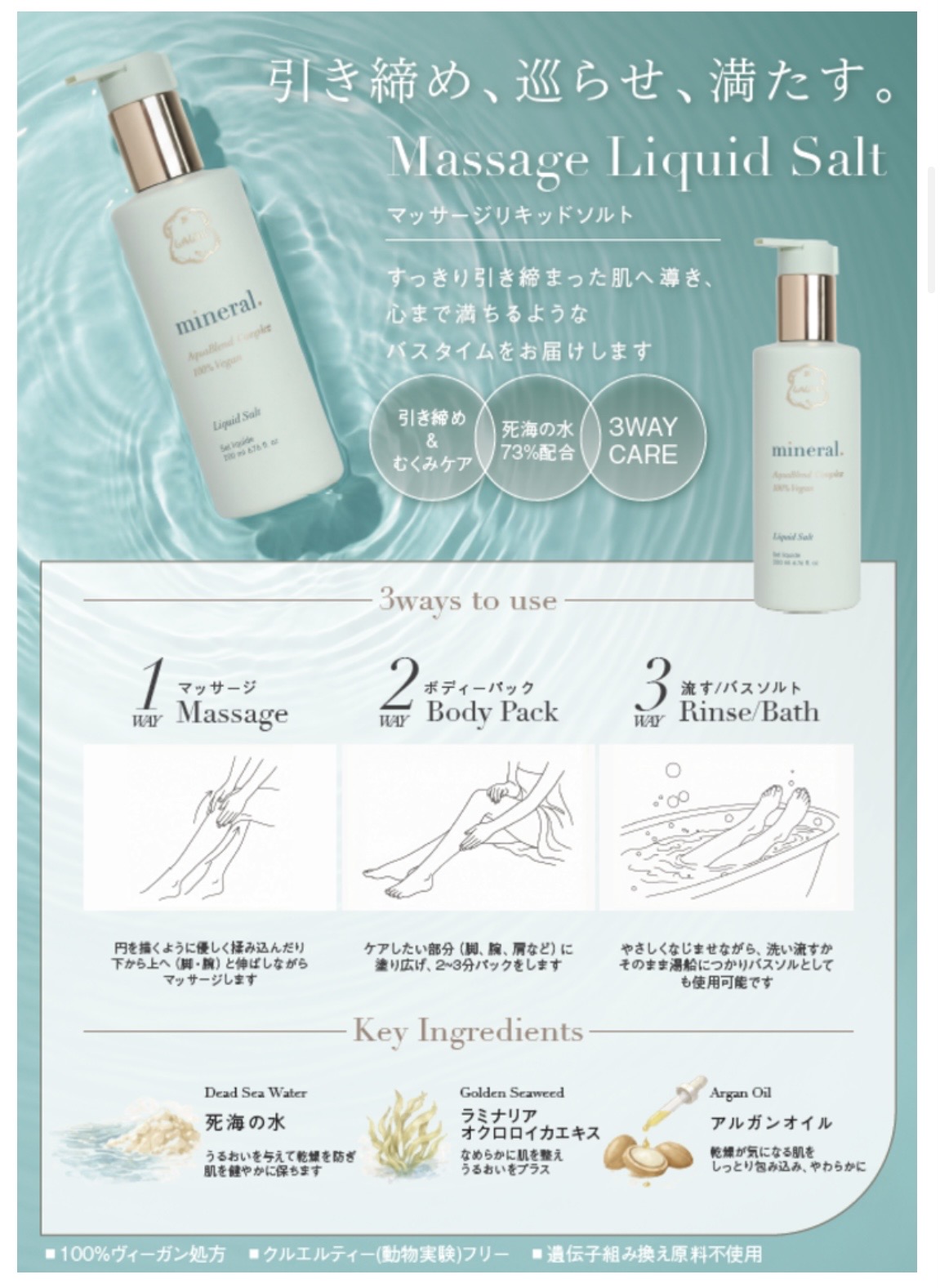 98.8%死海の海水を配合したマッサージリキッドは、お風呂の中で簡単にマッサージができるアイテム。
