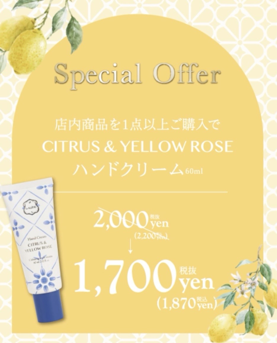 店内商品を1点以上ご購入でハンドクリーム60mlサイズが上代から300円引きになります♪