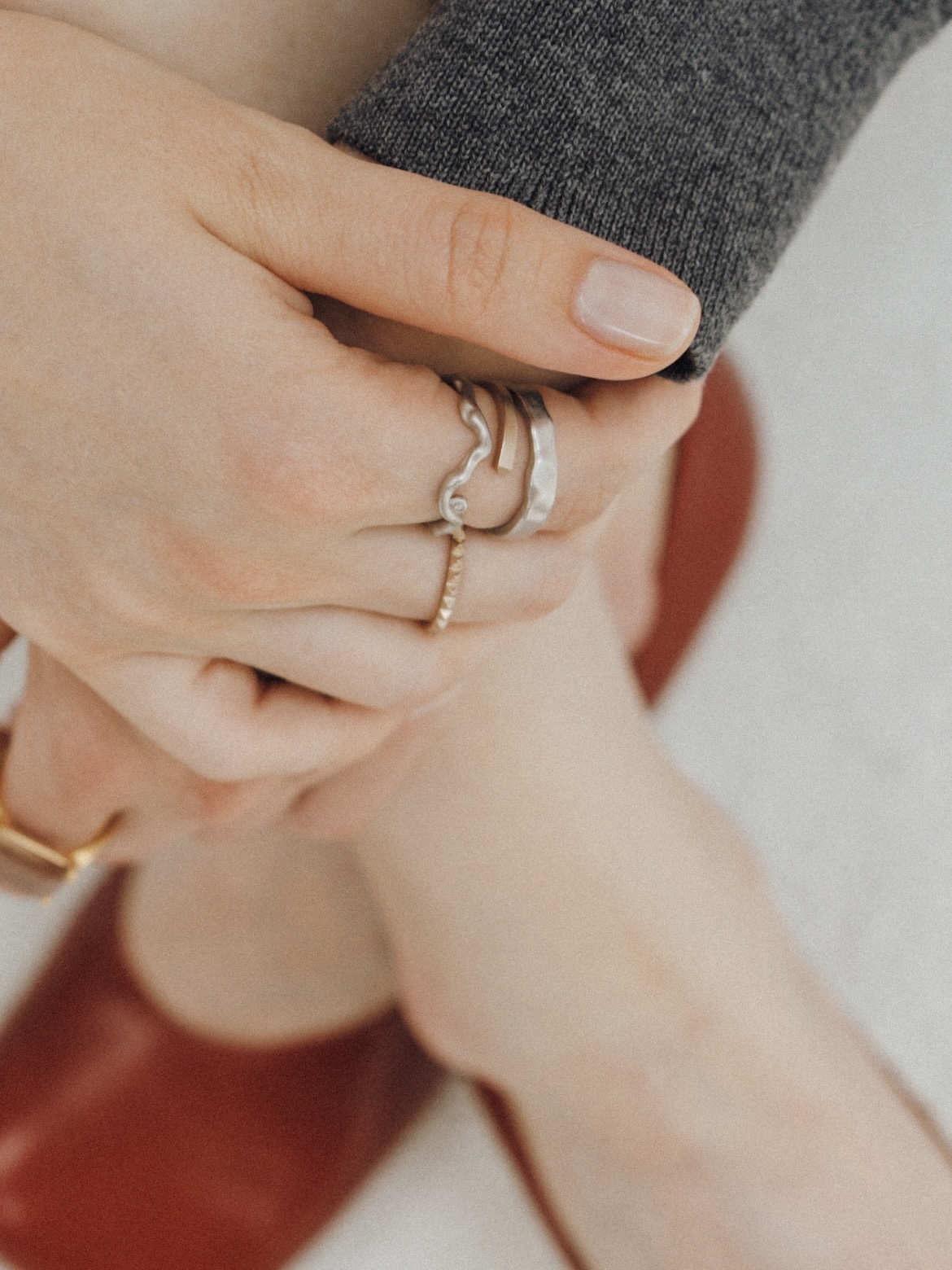 マットな質感でボリュームもあるリングやバングルはカジュアルな服装に合わせて頂けて、またパールやダイヤが女性らしく上品さも演出してくれます!