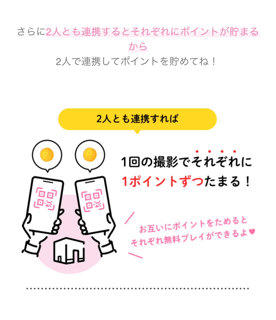 1回の撮影でそれぞれ1ポイントずつ貯まりますので、2人分連携し2回撮影すると2回無料で撮影できます❤️